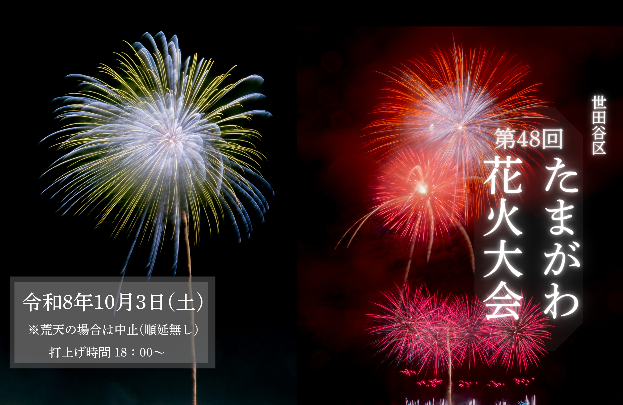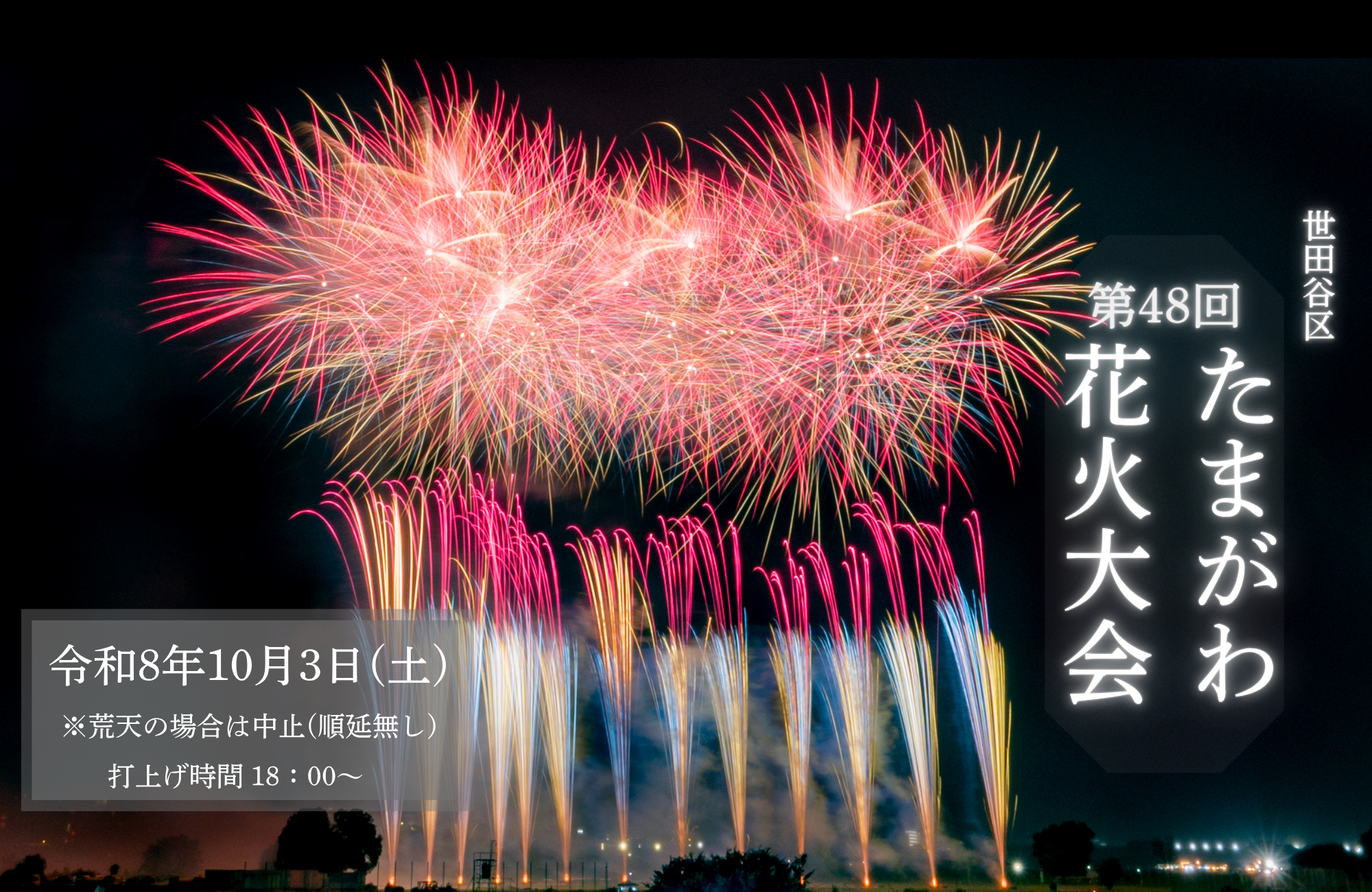 ― 最新情報 ― [たまがわ花火大会写真投稿コンテスト2025]入賞者発表2025年12月1日 大会当日の注意事項2025年10月3日 花火大会まで1週間を切りました!2025年9月30日 Tweets by setagaya_hanabi ※Xアカウントにログインすると最新情報が表示されます。